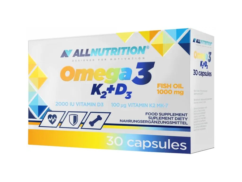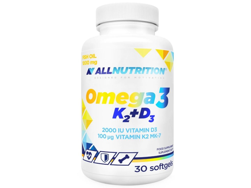 Allnutrition Omega 3 D3 + K2 je koncentrovaný rybí olej s obsahom zdravých omega 3 mastných kyselín obohatený o vitamíny D3 a K2. Esenciálne mastné kyseliny sú tvorené z EPA (kyselina eikosapentaenová) a DHA (kyselina dokosahexaenová). Omega-3 mastné kyseliny môžu znižovať riziko kardiovaskulárnych ochorení a zlepšovať fyzickú a duševnú kondíciu, uľahčujú vstrebávanie vápniku, pomáhajú udržovať zdravé kosti a chránia pred zápalom kĺbov. Vitamín K prispieva k správnej zrážanlivosti krvi a k udržaniu zdravých kostí. Vitamín D napomáha k činnosti svalov a imunitného systému. Tiež prispieva k udržaniu zdravých kostí a zubov.