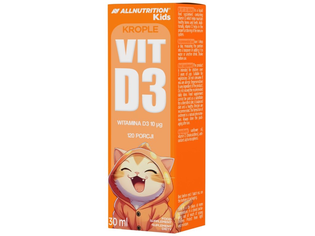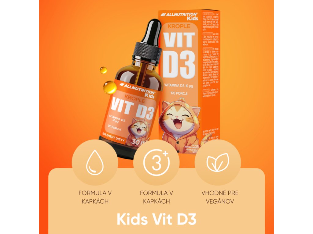 ALLNUTRITION KIDS VIT D3 je doplnok stravy vo forme kvapiek, špeciálne vyvinutý pre deti od 3 rokov.