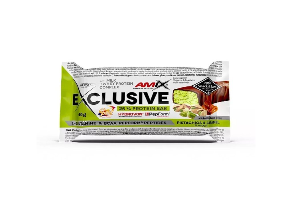Zloženie pre príchuť Pistácie & karamel: Amix ™ MilkPro ® Protein Blend 19,8 % ( mliečny bielkovinový izolát / z mlieka /, CFM ® srvátkový bielkovinový izolát a koncentrát / z mlieka / , čiastočne hydrolyzovaný srvátkový bielkovin hydrolyzované Peptidy /L-Glutamín PepForm®, BCAA PepForm® - z mlieka /); mliečna čokoláda 15 % (cukor, kakaové maslo, sušené plnotučné mlieko , kakaová hmota, kakaový prášok so zníženým obsahom tuku, emulgátor: / sójový lecitín, E476/, vanilkový extrakt, aróma); plnidlo: polydextróza; hydrolyzované hovädzie peptidy Hydrobeef™; fruktóza; zvlhčovadlo: glycerol, glukóza; sušené odtučnené mlieko , rastlinný tuk (palmojadrový olej, palmový a bambucký olej); 4,2% ryžovej chrumky (ryža 98%, polynol – monoglycerid z palmového oleja); sójový bielkovinový izolát; 3,8 % lúpané jadrá pistácií ; zvlhčovadlo: sorbitol; maltodextrín, emulgátor: sójový lecitín; čistená voda; regulátor kyslosti: kyselina citrónová, aróma, farbivo: meďnaté komplexy chlorofylov; antioxidant: mix tokoferolov D.