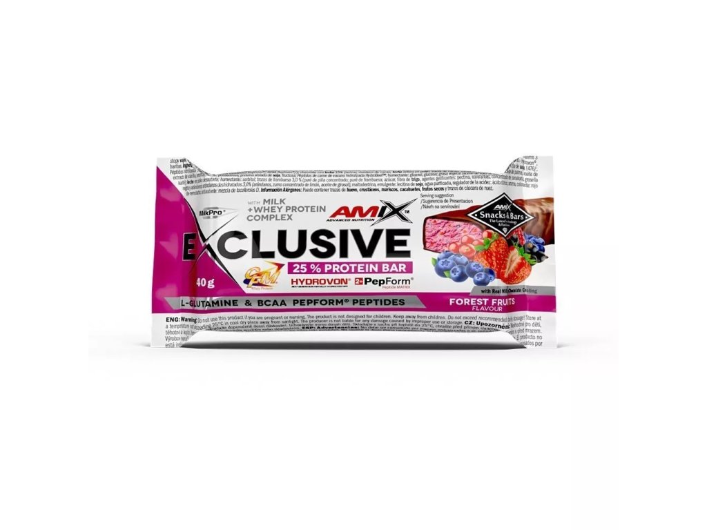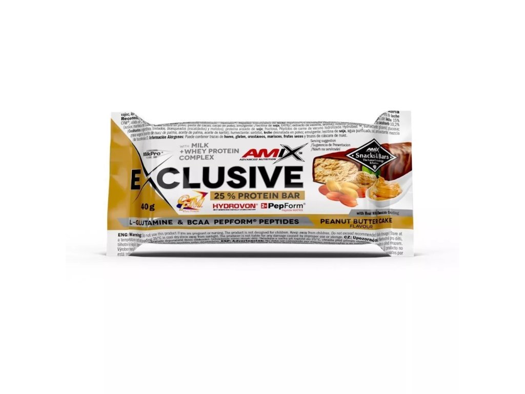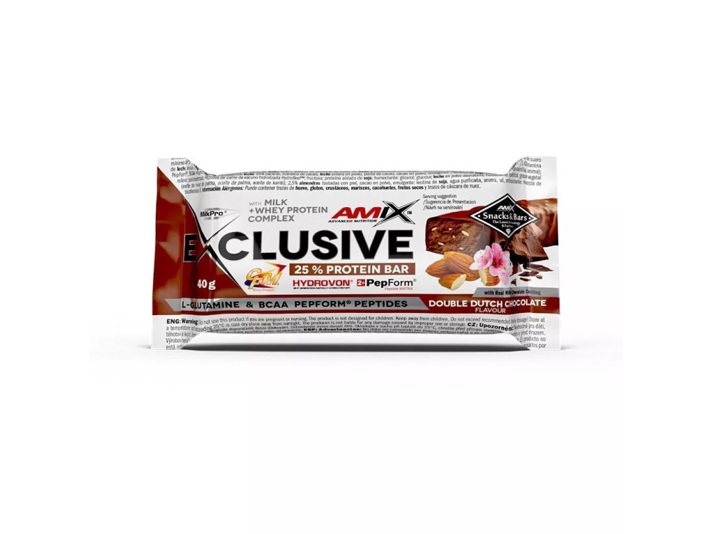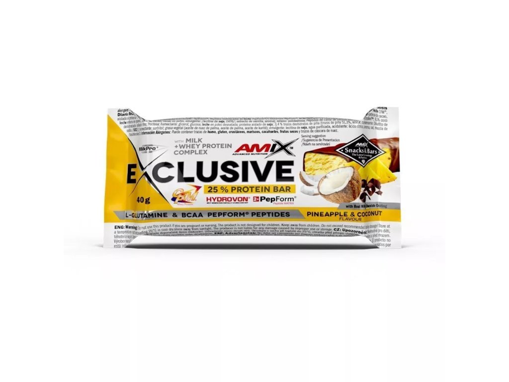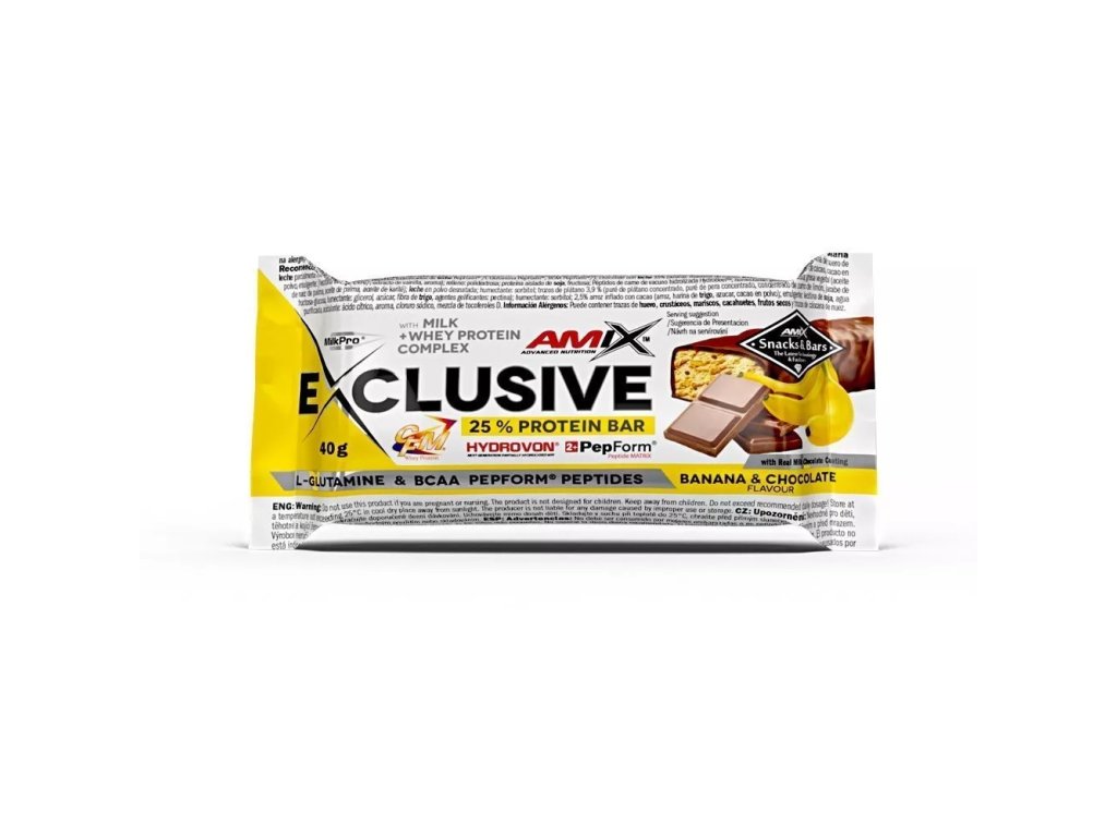 Amix Exclusive Protein bar je lahodná tyčinka s vysokým obsahom bielkovín, vyrobená z najvyššej kvality bielkovín MilkPro a Protein Blend. Tyčinky obsahujú patentované suroviny: CFM srvátkový bielkovinový izolát a koncentrát HydroVon, čo zabezpečuje ich výnimočnú kvalitu. Ďalšie zložky zahŕňajú hydrolyzované peptidy L-glutamínu PepForm a BCAA PepForm. Pre rýchle zastavenie hladu je Exclusive Protein bar ideálnou voľbou, ktorú si môžete vychutnať pred alebo po tréningu. Ponúkame 10 rozmanitých príchutí, z ktorých si iste vyberiete aspoň jednu, ktorú si zamilujete!