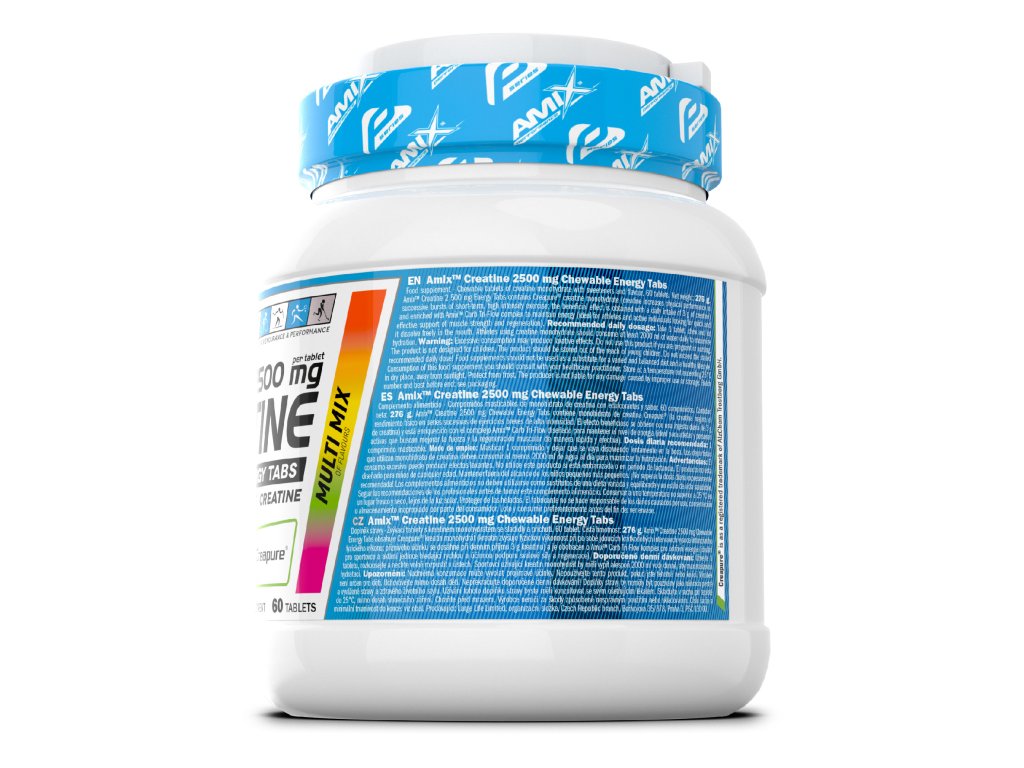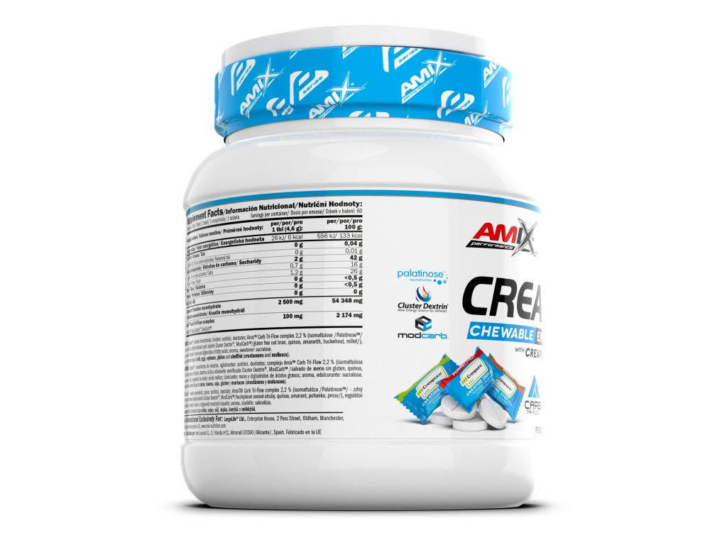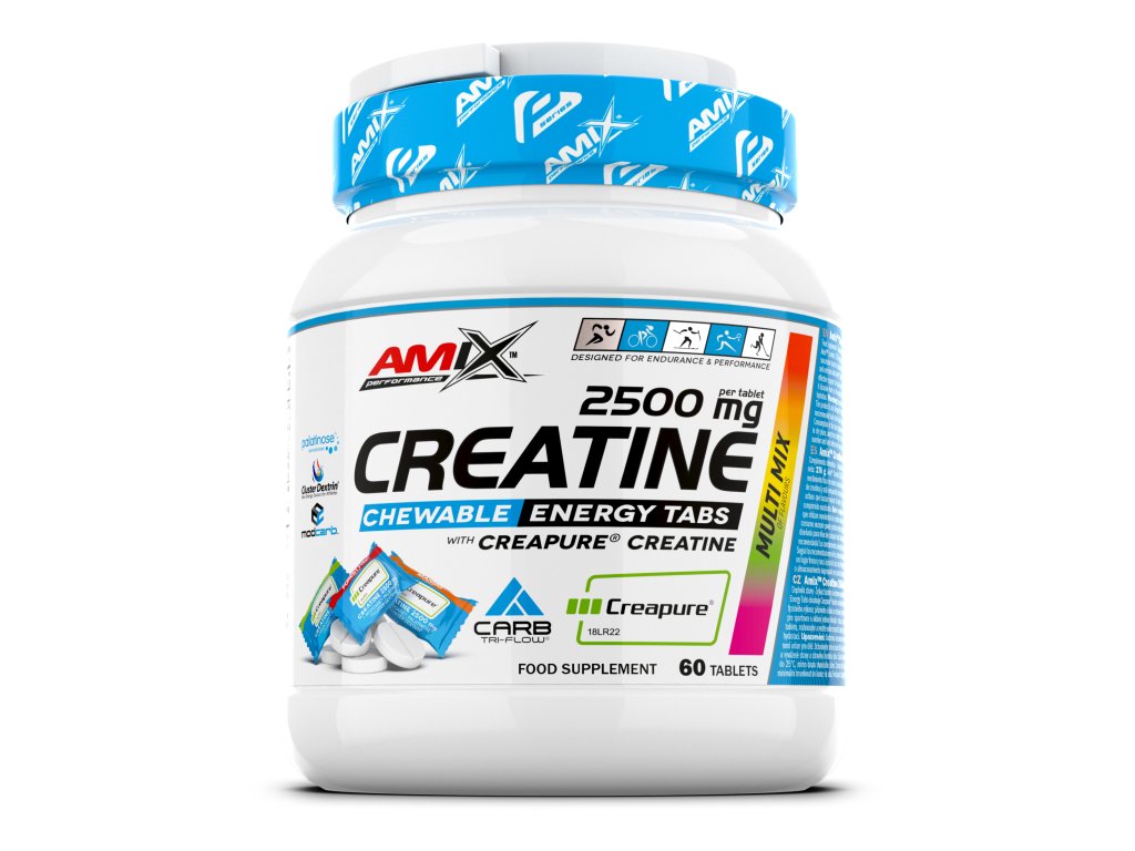 Amix Performance Creatine Creapure 2500 mg sú žuvacie tablety obsahujúce kreatín monohydrát Creapure®, doplnené o Carb Tri-Flow komplex pre lepšie udržanie energie. Každá tableta poskytuje 2 500 mg kreatínu, čo priamo prispieva k zvýšeniu fyzickej výkonnosti počas krátkodobých, vysoko intenzívnych cvičení.