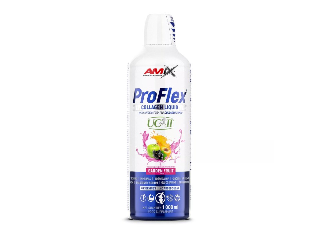 Amix™ ProFlex® Collagen Liquid je chutný nápojový koncentrát s bohatým zložením pre podporu kĺbov, kostí, svalov a celkovej vitality. Obsahuje kolagénne hydrolyzáty (vrátane UC-II® nedenaturovaného kolagénu typu II), ako aj ďalšie účinné látky a vitamíny.