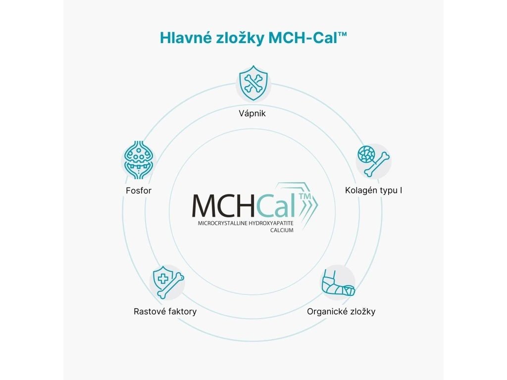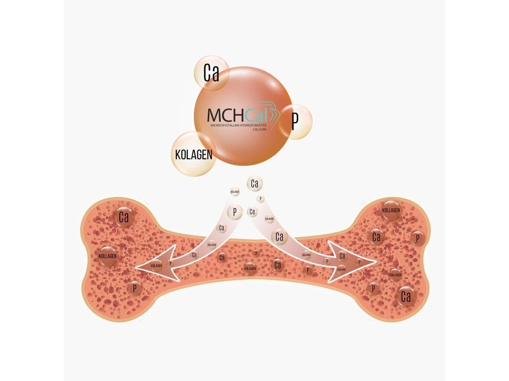 MCHCal™ je mikrokryštalický hydroxyapatitový vápnik, ktorý obsahuje nielen vápnik, ale aj fosfor, kolagén typu I a rastové faktory. Tieto zložky podporujú prirodzenú štruktúru a funkciu kostí a zaisťujú ich efektívnu regeneráciu. -