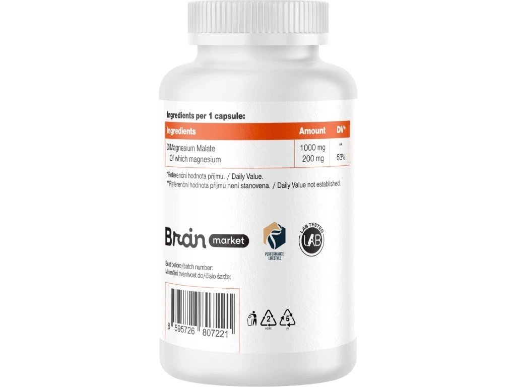 Magnézium malát je organická forma magnézia, čo je zvlášť dôležité pre osoby s citlivým tráviacim traktom. Vďaka obsahu malátu, teda kyseliny jablčnej, je odporúčaný na podporu energetického metabolizmu a je tiež vhodná pre ľudí trpiacich svalovou bolesťou alebo fibromyalgiou, pretože kombinácia horčíka a kyseliny jablčnej prispieva k relaxácii svalov. Oproti citrátu obsahuje malát cca o 9 % viac elementárneho horčíka a nepôsobí preháňavo pri vyšších dávkach . 1 kapsula obsahuje 53% DDD horčíka.