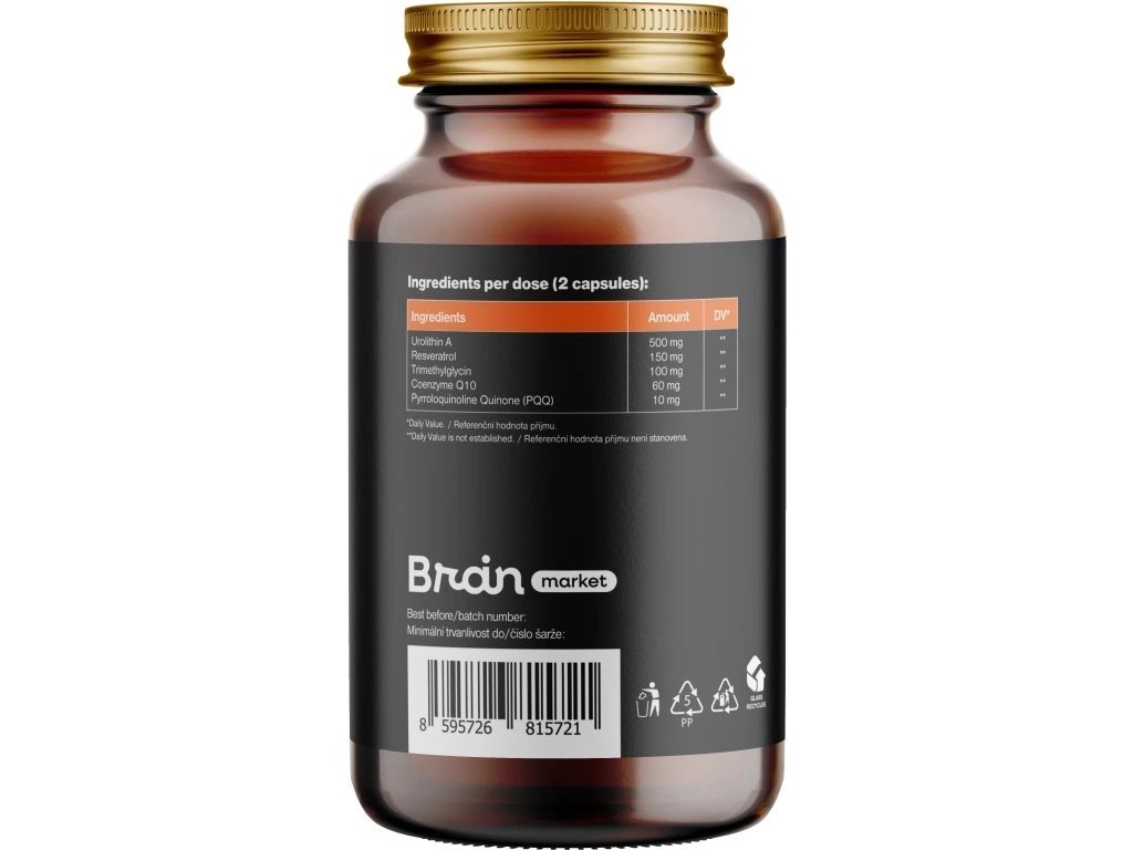 Zloženie: Urolitin A (500 mg, RHP**), Resveratrol (150 mg, RHP**), Trimetylglycín (TMG) (100 mg, RHP**), Koenzým Q10 (60 mg, RHP**), Pyrrolochinolín chinón (PQQ) (10 mg, RHP **). Rastlinná kapsula na báze HPMC. Neobsahuje žiadne balastné látky (éčka).