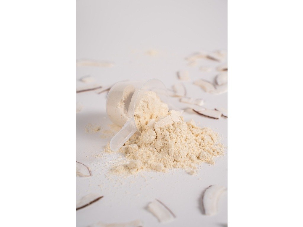 Zloženie: (87 %) srvátkový proteínový koncentrát (mlieko, emulgátor: slnečnicový lecitín), (2,6 %) kokosové mlieko prášok*, (2 %) kokos strúhaný jemný*, zahusťovadlo: guma guar*, prírodná aróma, sladidlo: *produkt z ekologického poľnohospodárstva.