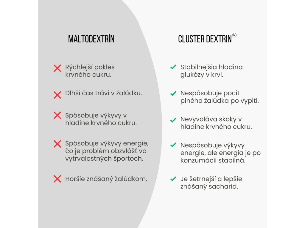 Cluster Dextrin® je komplexný sacharid rozpustný vo vode, ktorý prináša preukázané výhody pre športovcov a aktívnych jedincov – zvyšuje silu a vytrvalosť. Vďaka špeciálnej výrobe nezostáva dlho v žalúdku, rýchlo prechádza do tenkého čreva a postupne uvoľňuje energiu bez výkyvov hladiny cukru v krvi. Na rozdiel od maltodextrínu poskytuje stabilný prísun energie. Vyrába sa z kukuričného škrobu enzymatickou reakciou, nejde teda o chemickú zlúčeninu ani zmes sacharidov, ale o čistý Cluster Dextrin®.
