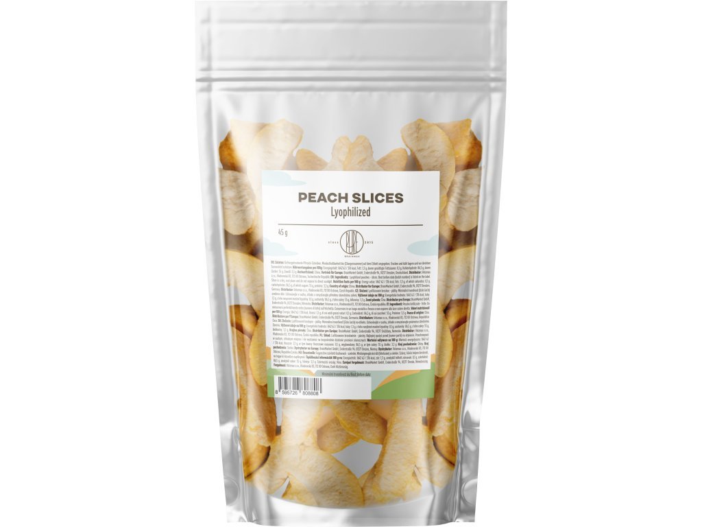 - Šetrné spracovanie: Proces lyofilizácie zachováva všetky dôležité živiny a vitamíny, zaisťuje dlhú trvanlivosť a autentickú textúru broskýň