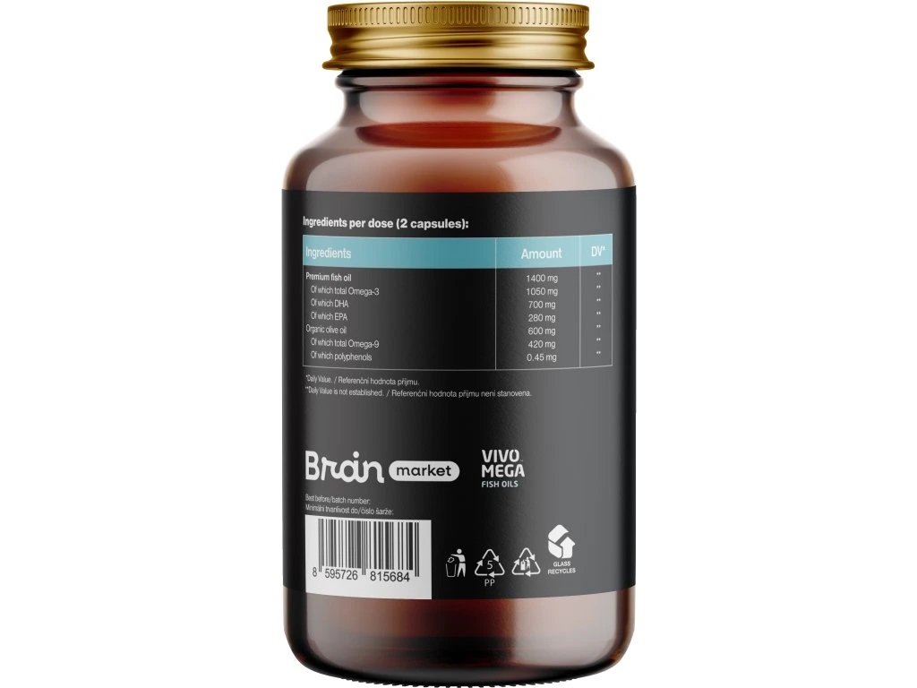 BrainMax Super Omega-3 využíva patentovaný prémiový rybí olej VivoMega®, známy pre svoju výnimočnú čistotu a vysokú koncentráciu esenciálnych mastných kyselín DHA a EPA. Každá dávka (2 kapsule) obsahuje 700 mg DHA a 280 mg EPA, čo zaručuje maximálny účinok na zdravie mozgu, srdca a očí.