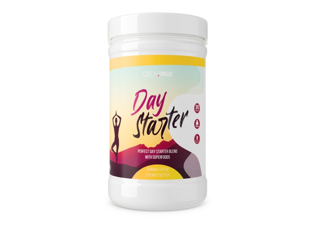 Czech Virus Day Starter je komplexné smoothie obsahujúci superpotravín pre ten najlepší štart dňa. Tvorí ho celozrnná ovsená múka a kvalitný hrachový izolát. Produkt je jednoducho stráviteľný a doplní makroživiny po nočnom pôste. Pre postupné nakopnutie obsahuje prírodný kofeín z guarany a zeleného čaju bez nežiaduceho dojazdu. Ďalej tvorí citrulínu s červenú repou pre dostatočné prekrvenie. Day Starter obsahuje kvalitné makroživiny, ktoré sú ľahko stráviteľné. Tvorí slušné množstvo vlákniny a proteín zastupuje izolát z hrachového proteínu.